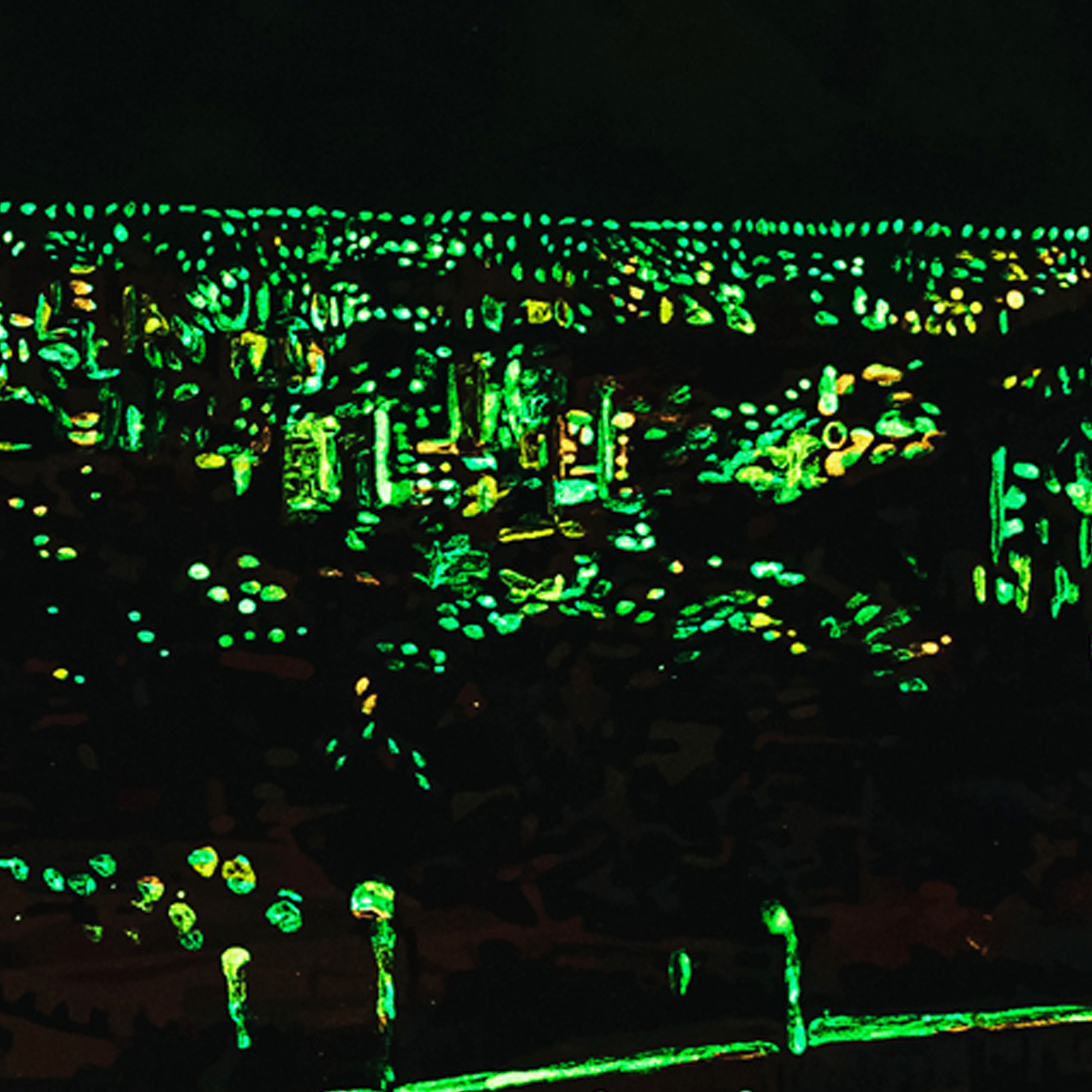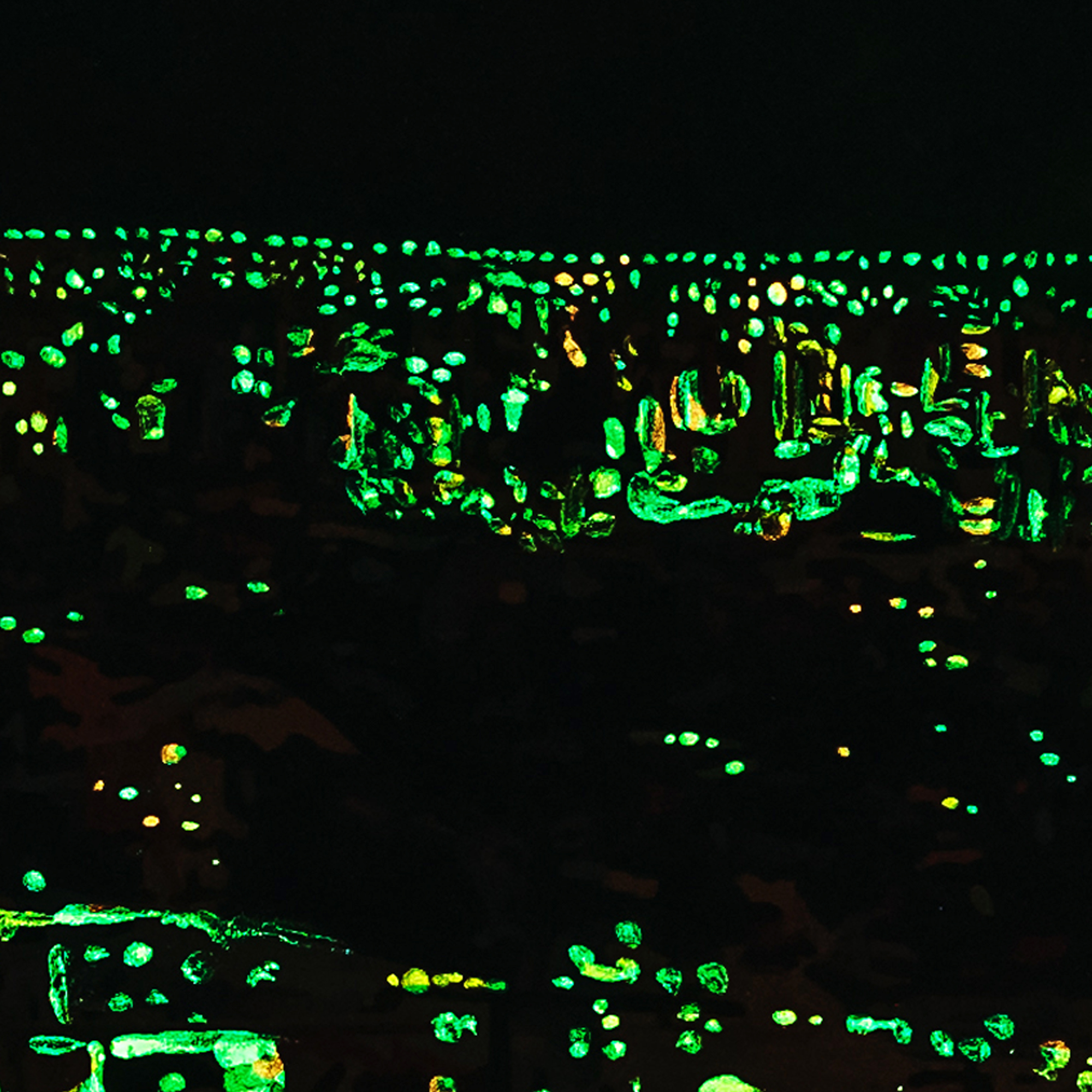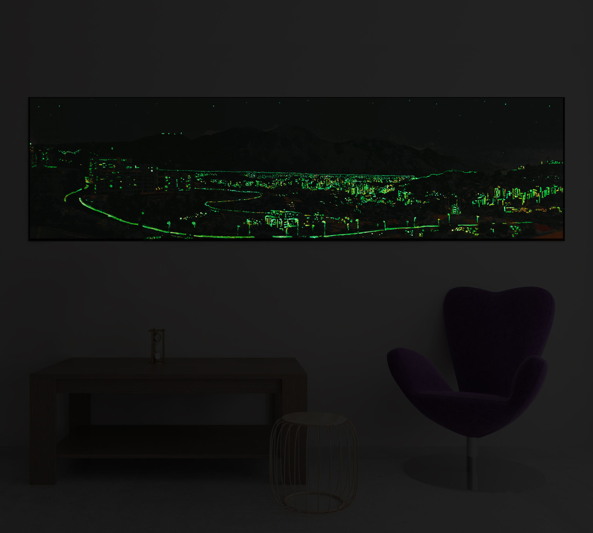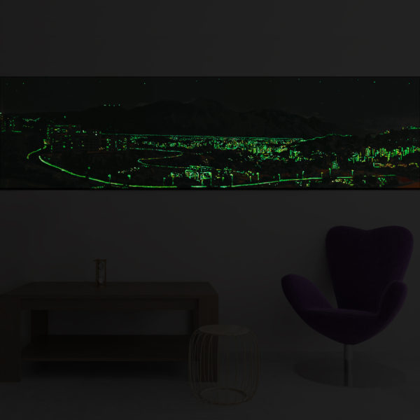 Cuando las luces se apagan, la obra se transforma en la ciudad por la noche. Con pintura especial que brilla en la oscuridad, toma vida en la noche mostrando las luces de la ciudad.