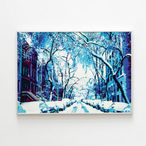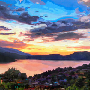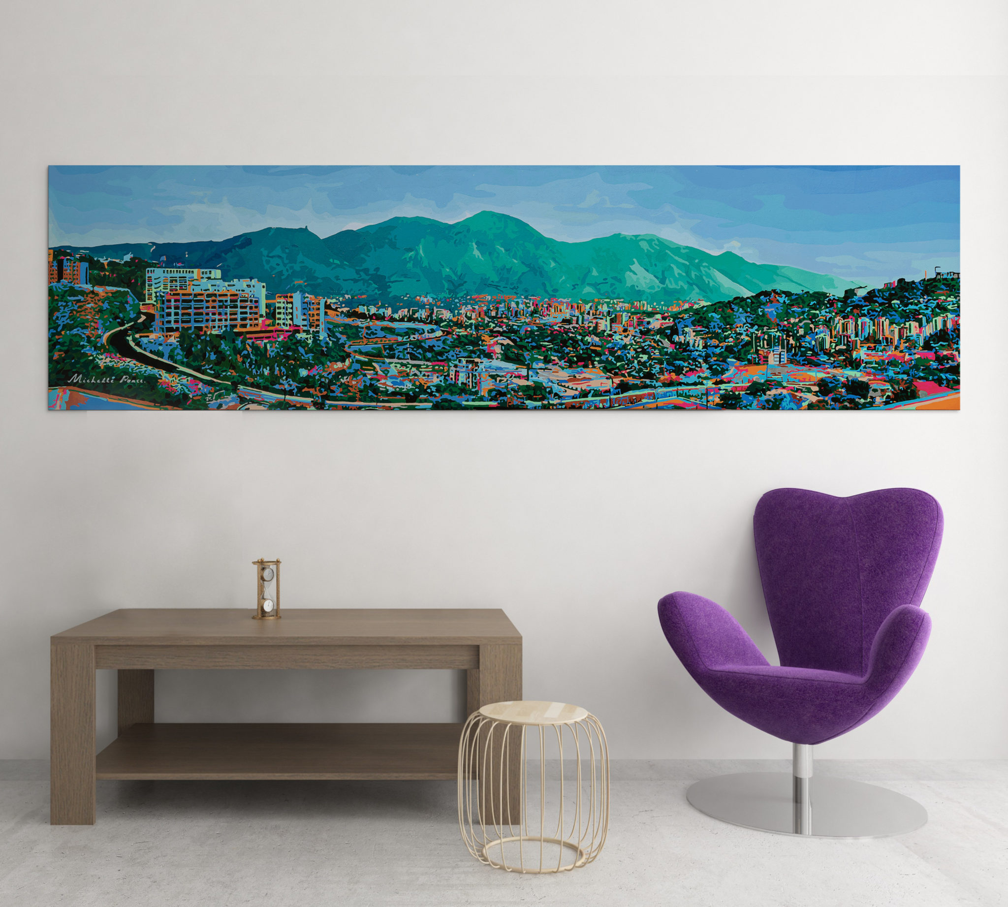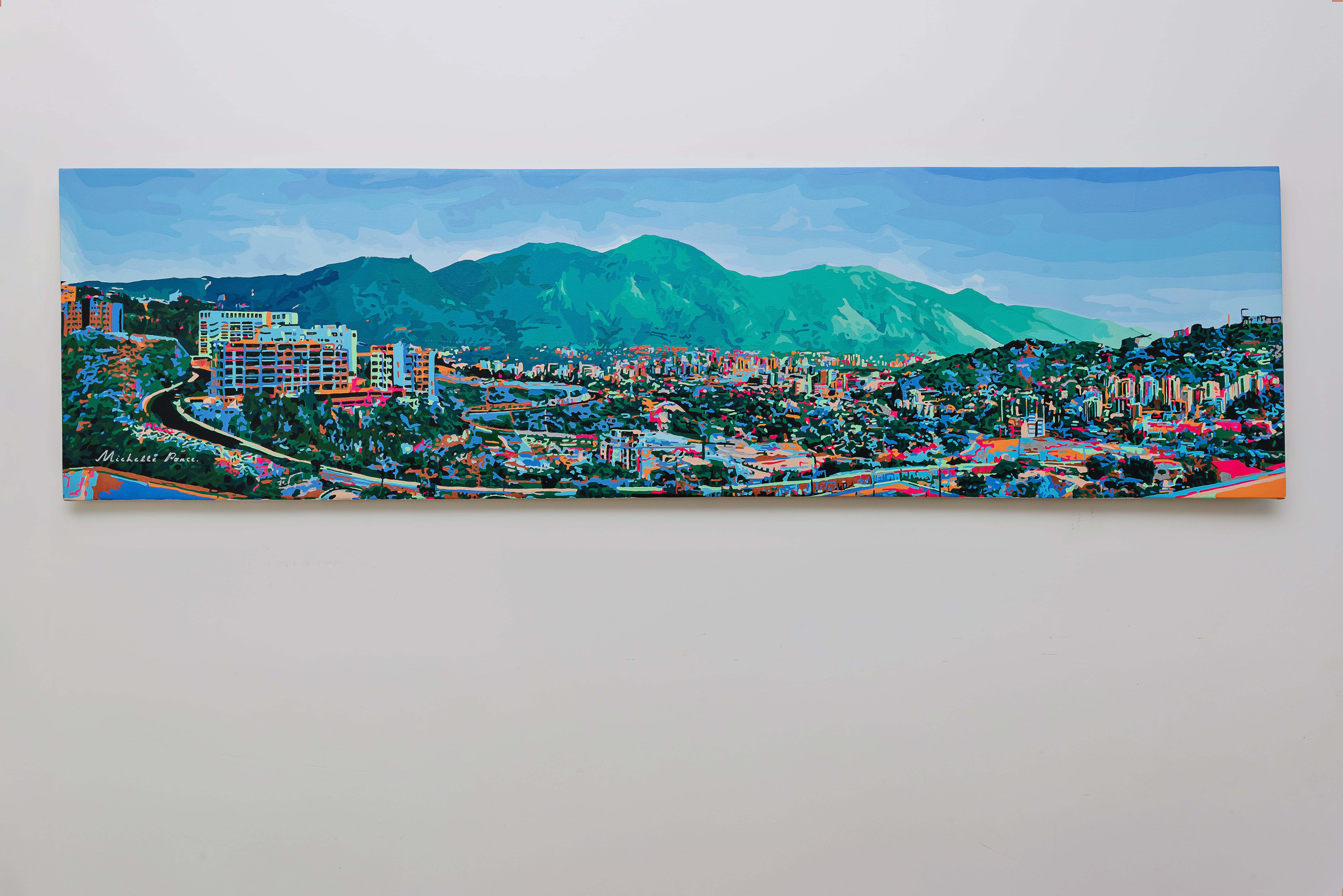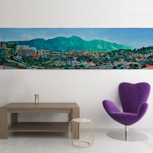 Mi último proyecto, “Antonimia Caraqueña”, es una pintura horizontal de la vista de la ciudad de Caracas en Venezuela, hecha con acrílico y pintura especial que brilla en la oscuridad.